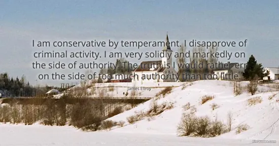 Ellroy, James. "I am conservative by temperament. I disapprove of criminal activity. I am very solidly and markedly on the side of authority. The truth is I would rather err on the side of too much authority than too little." FixQuotes. January 15, 2026. https://fixquotes.com/quotes/i-am-conservative-by-temperament-i-disapprove-of-151708/.