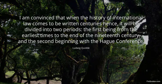 Quidde, Ludwig. "I am convinced that when the history of international law comes to be written centuries hence, it will be divided into two periods: the first being from the earliest times to the end of the nineteenth century, and the second beginning with the Hague Conference." FixQuotes. January 17, 2026. https://fixquotes.com/quotes/i-am-convinced-that-when-the-history-of-61122/.