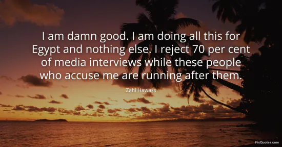 Hawass, Zahi. (2026, January 16). I am damn good. I am doing all this for Egypt and nothing else. I reject 70 per cent of media interviews while these people who accuse me are running after them. FixQuotes. https://fixquotes.com/quotes/i-am-damn-good-i-am-doing-all-this-for-egypt-and-114062/