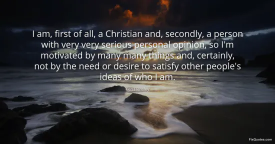 Hensley, Ken. (2026, January 16). I am, first of all, a Christian and, secondly, a person with very very serious personal opinion, so I'm motivated by many many things and, certainly, not by the need or desire to satisfy other people's ideas of who I am. FixQuotes. https://fixquotes.com/quotes/i-am-first-of-all-a-christian-and-secondly-a-118698/