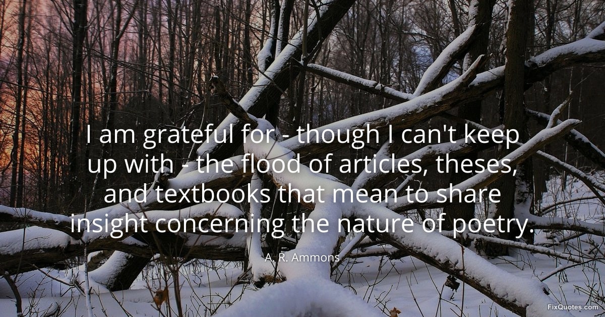 Ammons, A. R. (2026, January 17). I am grateful for - though I can't keep up with - the flood of articles, theses, and textbooks that mean to share insight concerning the nature of poetry. FixQuotes. https://fixquotes.com/quotes/i-am-grateful-for-though-i-cant-keep-up-with-43317/