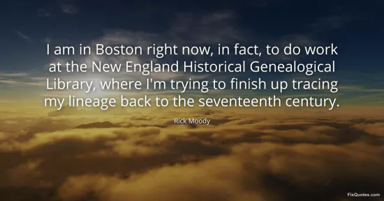 Moody, Rick. (2026, January 16). I am in Boston right now, in fact, to do work at the New England Historical Genealogical Library, where I'm trying to finish up tracing my lineage back to the seventeenth century. FixQuotes. https://fixquotes.com/quotes/i-am-in-boston-right-now-in-fact-to-do-work-at-102440/