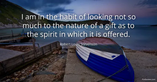Stevenson, Robert Louis. (2026, January 15). I am in the habit of looking not so much to the nature of a gift as to the spirit in which it is offered. FixQuotes. https://fixquotes.com/quotes/i-am-in-the-habit-of-looking-not-so-much-to-the-1527/