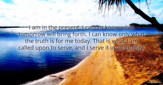 Stravinsky, Igor. (2026, January 17). I am in the present. I cannot know what tomorrow will bring forth. I can know only what the truth is for me today. That is what I am called upon to serve, and I serve it in all lucidity. FixQuotes. https://fixquotes.com/quotes/i-am-in-the-present-i-cannot-know-what-tomorrow-68332/