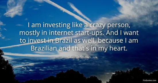 Saverin, Eduardo. "I am investing like a crazy person, mostly in internet start-ups. And I want to invest in Brazil as well, because I am Brazilian and that's in my heart." FixQuotes. January 15, 2026. https://fixquotes.com/quotes/i-am-investing-like-a-crazy-person-mostly-in-172713/.