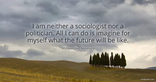 Antonioni, Michelangelo. (2026, January 15). I am neither a sociologist nor a politician. All I can do is imagine for myself what the future will be like. FixQuotes. https://fixquotes.com/quotes/i-am-neither-a-sociologist-nor-a-politician-all-i-152457/