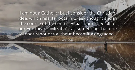 Weil, Simone. "I am not a Catholic; but I consider the Christian idea, which has its roots in Greek thought and in the course of the centuries has nourished all of our European civilization, as something that one cannot renounce without becoming degraded." FixQuotes. January 17, 2026. https://fixquotes.com/quotes/i-am-not-a-catholic-but-i-consider-the-christian-24158/.