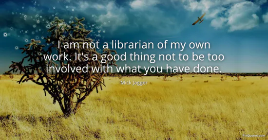 Jagger, Mick. "I am not a librarian of my own work. It's a good thing not to be too involved with what you have done." FixQuotes. January 15, 2026. https://fixquotes.com/quotes/i-am-not-a-librarian-of-my-own-work-its-a-good-143238/.