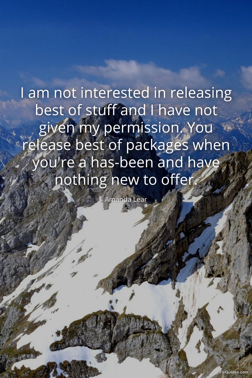 Lear, Amanda. (2026, January 17). I am not interested in releasing best of stuff and I have not given my permission. You release best of packages when you're a has-been and have nothing new to offer. FixQuotes. https://fixquotes.com/quotes/i-am-not-interested-in-releasing-best-of-stuff-40107/