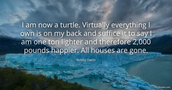 Darin, Bobby. "I am now a turtle. Virtually everything I own is on my back and suffice it to say I am one ton lighter and therefore 2,000 pounds happier. All houses are gone." FixQuotes. January 17, 2026. https://fixquotes.com/quotes/i-am-now-a-turtle-virtually-everything-i-own-is-49567/.