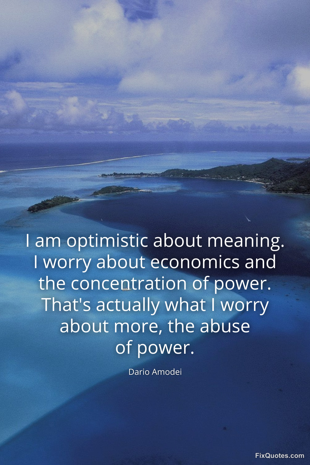 "I am optimistic about meaning. I worry about economics and the concentration of power. That's actually what I worry about more, the abuse of power." FixQuotes, 16 Feb. 2026, https://fixquotes.com/quotes/i-am-optimistic-about-meaning-i-worry-about-185492/. Accessed 20 Feb. 2026.