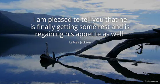 Jackson, LaToya. "I am pleased to tell you that he is finally getting some rest and is regaining his appetite as well." FixQuotes. January 17, 2026. https://fixquotes.com/quotes/i-am-pleased-to-tell-you-that-he-is-finally-81260/.