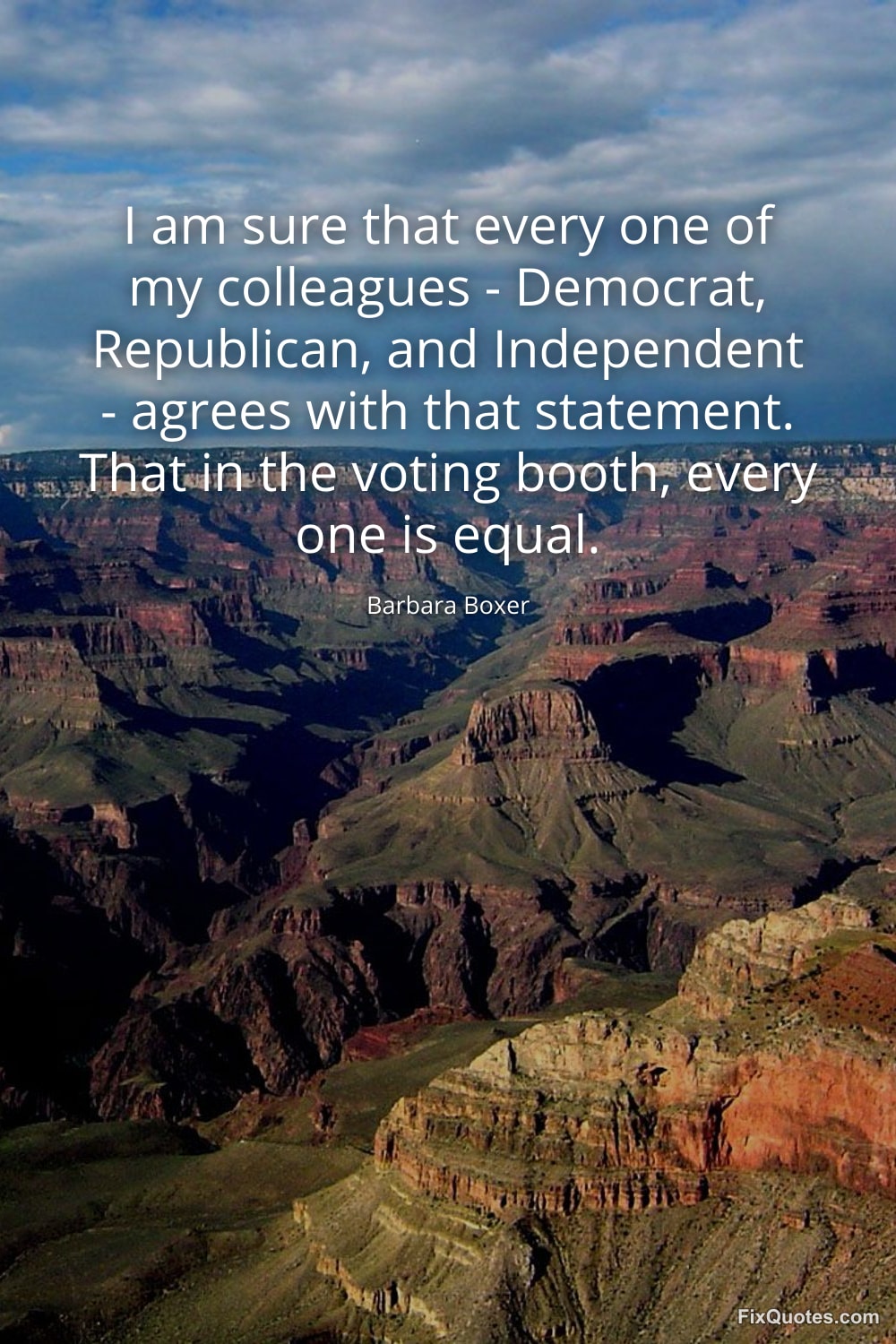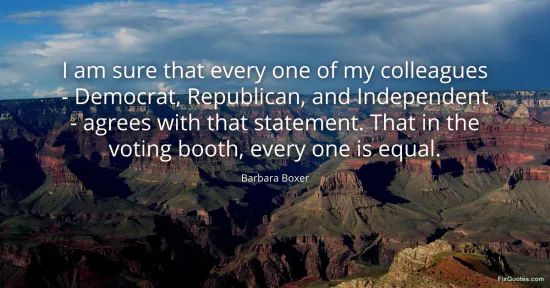 Boxer, Barbara. (2026, January 17). I am sure that every one of my colleagues - Democrat, Republican, and Independent - agrees with that statement. That in the voting booth, every one is equal. FixQuotes. https://fixquotes.com/quotes/i-am-sure-that-every-one-of-my-colleagues-36965/