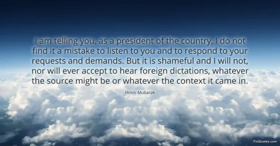 Mubarak, Hosni. "I am telling you, as a president of the country, I do not find it a mistake to listen to you and to respond to your requests and demands. But it is shameful and I will not, nor will ever accept to hear foreign dictations, whatever the source might be or whatever the context it came in." FixQuotes. January 15, 2026. https://fixquotes.com/quotes/i-am-telling-you-as-a-president-of-the-country-i-144400/.