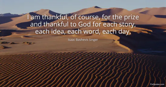 Singer, Isaac Bashevis. (2026, January 17). I am thankful, of course, for the prize and thankful to God for each story, each idea, each word, each day. FixQuotes. https://fixquotes.com/quotes/i-am-thankful-of-course-for-the-prize-and-73155/