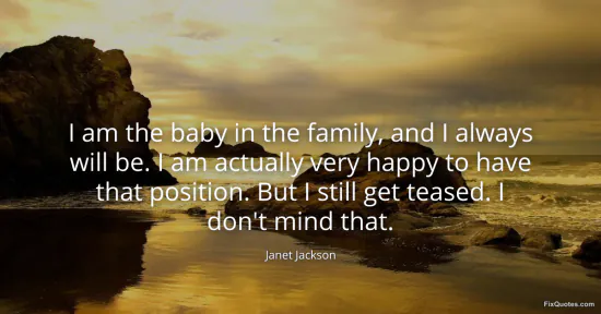 Jackson, Janet. "I am the baby in the family, and I always will be. I am actually very happy to have that position. But I still get teased. I don't mind that." FixQuotes. January 16, 2026. https://fixquotes.com/quotes/i-am-the-baby-in-the-family-and-i-always-will-be-125855/.
