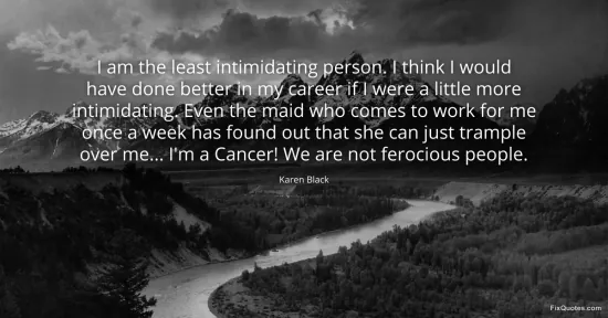 Black, Karen. "I am the least intimidating person. I think I would have done better in my career if I were a little more intimidating. Even the maid who comes to work for me once a week has found out that she can just trample over me... I'm a Cancer! We are not ferocious people." FixQuotes. January 16, 2026. https://fixquotes.com/quotes/i-am-the-least-intimidating-person-i-think-i-118284/.