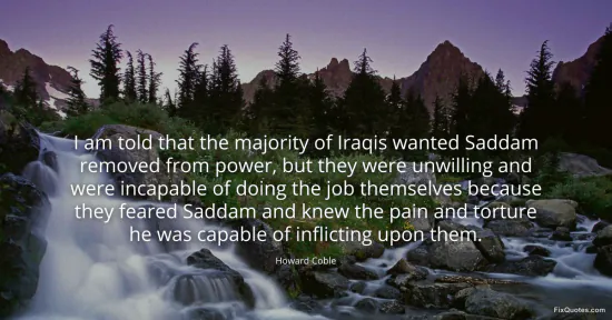 Coble, Howard. (2026, January 17). I am told that the majority of Iraqis wanted Saddam removed from power, but they were unwilling and were incapable of doing the job themselves because they feared Saddam and knew the pain and torture he was capable of inflicting upon them. FixQuotes. https://fixquotes.com/quotes/i-am-told-that-the-majority-of-iraqis-wanted-60684/
