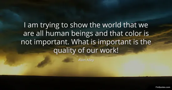 Ailey, Alvin. (2026, February 19). I am trying to show the world that we are all human beings and that color is not important. What is important is the quality of our work! FixQuotes. https://fixquotes.com/quotes/i-am-trying-to-show-the-world-that-we-are-all-43903/