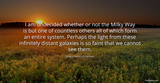 Lambert, Johann Heinrich. (2026, January 15). I am undecided whether or not the Milky Way is but one of countless others all of which form an entire system. Perhaps the light from these infinitely distant galaxies is so faint that we cannot see them. FixQuotes. https://fixquotes.com/quotes/i-am-undecided-whether-or-not-the-milky-way-is-122653/