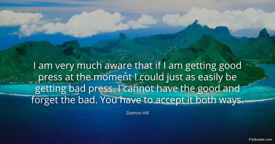 Hill, Damon. "I am very much aware that if I am getting good press at the moment I could just as easily be getting bad press. I cannot have the good and forget the bad. You have to accept it both ways." FixQuotes. January 15, 2026. https://fixquotes.com/quotes/i-am-very-much-aware-that-if-i-am-getting-good-140462/.