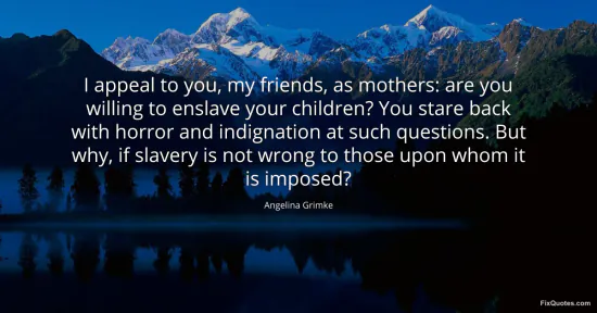 Grimke, Angelina. "I appeal to you, my friends, as mothers: are you willing to enslave your children? You stare back with horror and indignation at such questions. But why, if slavery is not wrong to those upon whom it is imposed?" FixQuotes. January 16, 2026. https://fixquotes.com/quotes/i-appeal-to-you-my-friends-as-mothers-are-you-108861/.