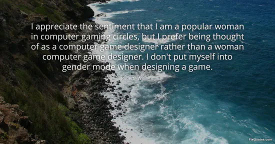 Williams, Roberta. "I appreciate the sentiment that I am a popular woman in computer gaming circles, but I prefer being thought of as a computer game designer rather than a woman computer game designer. I don't put myself into gender mode when designing a game." FixQuotes. February 17, 2026. https://fixquotes.com/quotes/i-appreciate-the-sentiment-that-i-am-a-popular-106691/.
