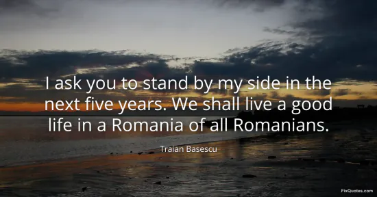 Basescu, Traian. (2026, January 17). I ask you to stand by my side in the next five years. We shall live a good life in a Romania of all Romanians. FixQuotes. https://fixquotes.com/quotes/i-ask-you-to-stand-by-my-side-in-the-next-five-76715/