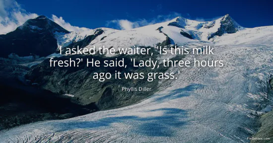 Diller, Phyllis. (2026, January 18). I asked the waiter, 'Is this milk fresh?' He said, 'Lady, three hours ago it was grass.'. FixQuotes. https://fixquotes.com/quotes/i-asked-the-waiter-is-this-milk-fresh-he-said-1230/