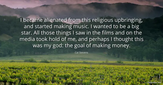 Stevens, Cat. "I became alienated from this religious upbringing, and started making music. I wanted to be a big star. All those things I saw in the films and on the media took hold of me, and perhaps I thought this was my god: the goal of making money." FixQuotes. January 18, 2026. https://fixquotes.com/quotes/i-became-alienated-from-this-religious-upbringing-7087/.