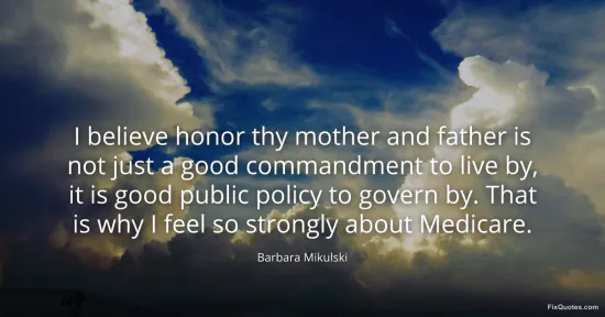 Mikulski, Barbara. (2026, January 17). I believe honor thy mother and father is not just a good commandment to live by, it is good public policy to govern by. That is why I feel so strongly about Medicare. FixQuotes. https://fixquotes.com/quotes/i-believe-honor-thy-mother-and-father-is-not-just-36969/