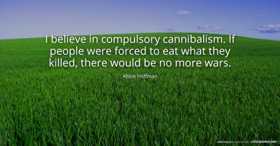 Hoffman, Abbie. (2026, January 17). I believe in compulsory cannibalism. If people were forced to eat what they killed, there would be no more wars. FixQuotes. https://fixquotes.com/quotes/i-believe-in-compulsory-cannibalism-if-people-35610/