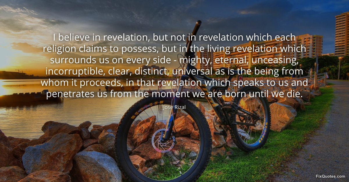 Rizal, Jose. "I believe in revelation, but not in revelation which each religion claims to possess, but in the living revelation which surrounds us on every side - mighty, eternal, unceasing, incorruptible, clear, distinct, universal as is the being from whom it proceeds, in that revelation which speaks to us and penetrates us from the moment we are born until we die." FixQuotes. February 10, 2026. https://fixquotes.com/quotes/i-believe-in-revelation-but-not-in-revelation-185101/.
