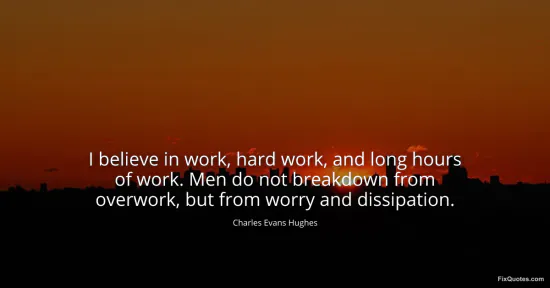 Hughes, Charles Evans. (2026, January 16). I believe in work, hard work, and long hours of work. Men do not breakdown from overwork, but from worry and dissipation. FixQuotes. https://fixquotes.com/quotes/i-believe-in-work-hard-work-and-long-hours-of-109703/