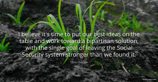 Chocola, Chris. "I believe it's time to put our best ideas on the table and work toward a bipartisan solution, with the single goal of leaving the Social Security system stronger than we found it." FixQuotes. January 15, 2026. https://fixquotes.com/quotes/i-believe-its-time-to-put-our-best-ideas-on-the-142110/.
