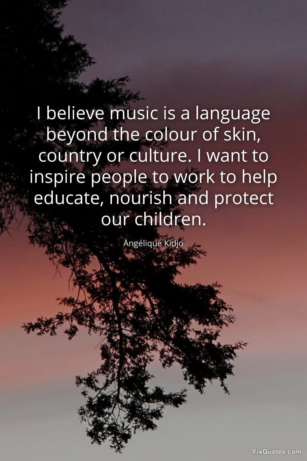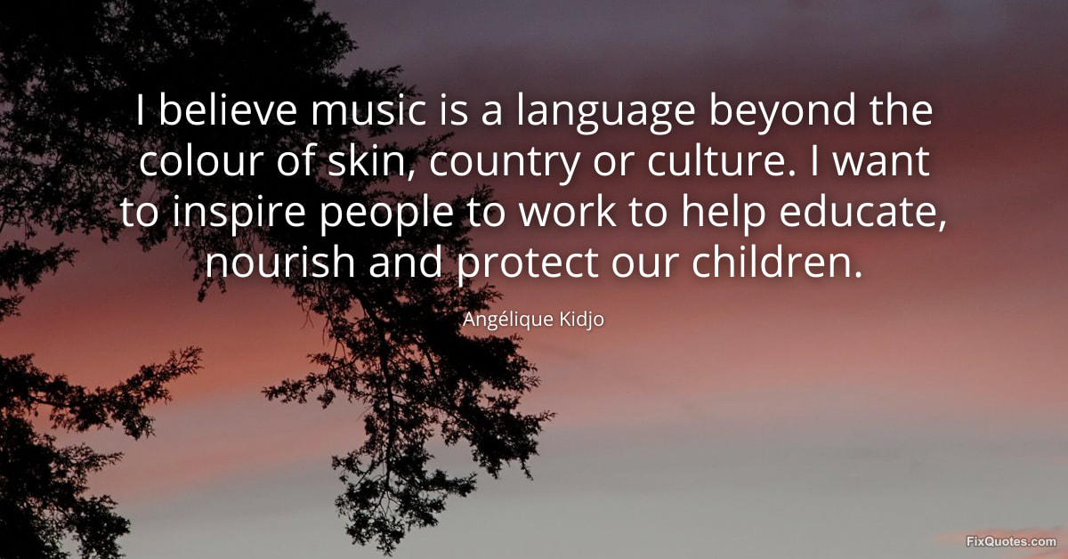 Kidjo, Angélique. (2026, February 15). I believe music is a language beyond the colour of skin, country or culture. I want to inspire people to work to help educate, nourish and protect our children. FixQuotes. https://fixquotes.com/quotes/i-believe-music-is-a-language-beyond-the-colour-185370/