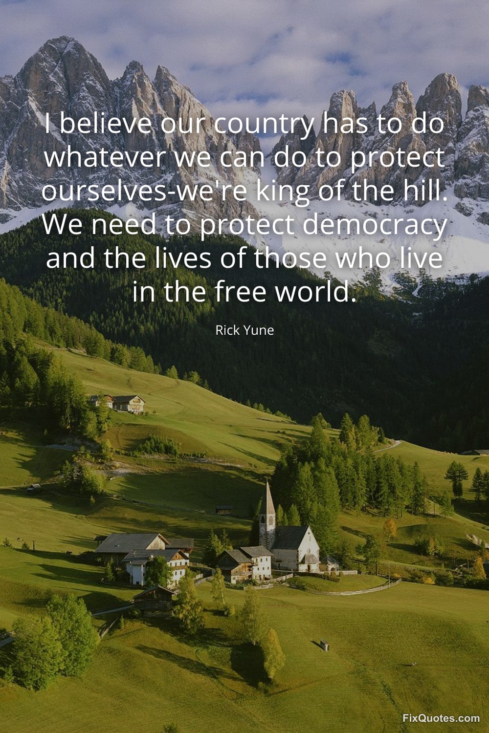 Yune, Rick. (2026, January 17). I believe our country has to do whatever we can do to protect ourselves-we're king of the hill. We need to protect democracy and the lives of those who live in the free world. FixQuotes. https://fixquotes.com/quotes/i-believe-our-country-has-to-do-whatever-we-can-71129/