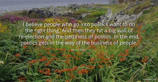 Costner, Kevin. (2026, January 16). I believe people who go into politics want to do the right thing. And then they hit a big wall of re-election and the pettiness of politics. In the end, politics gets in the way of the business of people. FixQuotes. https://fixquotes.com/quotes/i-believe-people-who-go-into-politics-want-to-do-107463/