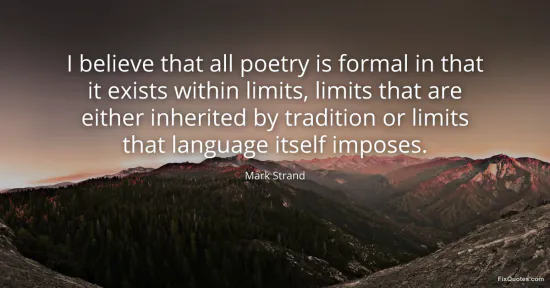 Strand, Mark. "I believe that all poetry is formal in that it exists within limits, limits that are either inherited by tradition or limits that language itself imposes." FixQuotes. January 16, 2026. https://fixquotes.com/quotes/i-believe-that-all-poetry-is-formal-in-that-it-115180/.