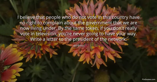 Bixby, Bill. "I believe that people who do not vote in this country have no right to complain about the government that we are now living under. By the same token, if you don't really vote in television, you're never going to have your way. Write a letter to the president of the network." FixQuotes. January 15, 2026. https://fixquotes.com/quotes/i-believe-that-people-who-do-not-vote-in-this-170531/.