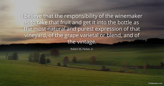 Jr., Robert M. Parker,. "I believe that the responsibility of the winemaker is to take that fruit and get it into the bottle as the most natural and purest expression of that vineyard, of the grape varietal or blend, and of the vintage." FixQuotes. January 16, 2026. https://fixquotes.com/quotes/i-believe-that-the-responsibility-of-the-137151/.
