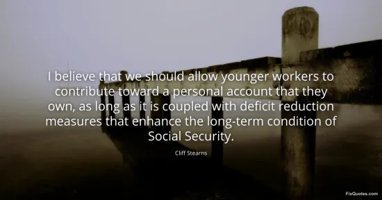 Stearns, Cliff. (2026, January 15). I believe that we should allow younger workers to contribute toward a personal account that they own, as long as it is coupled with deficit reduction measures that enhance the long-term condition of Social Security. FixQuotes. https://fixquotes.com/quotes/i-believe-that-we-should-allow-younger-workers-to-143373/