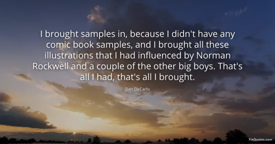 DeCarlo, Dan. "I brought samples in, because I didn't have any comic book samples, and I brought all these illustrations that I had influenced by Norman Rockwell and a couple of the other big boys. That's all I had, that's all I brought." FixQuotes. January 17, 2026. https://fixquotes.com/quotes/i-brought-samples-in-because-i-didnt-have-any-43978/.