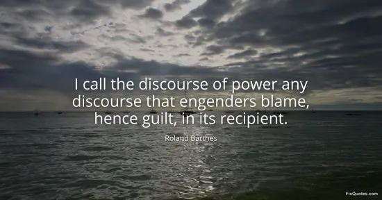 Barthes, Roland. (2026, January 15). I call the discourse of power any discourse that engenders blame, hence guilt, in its recipient. FixQuotes. https://fixquotes.com/quotes/i-call-the-discourse-of-power-any-discourse-that-106444/