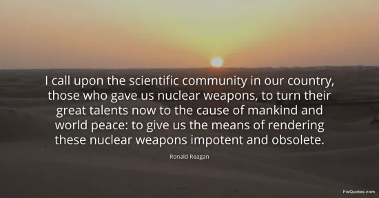 Reagan, Ronald. "I call upon the scientific community in our country, those who gave us nuclear weapons, to turn their great talents now to the cause of mankind and world peace: to give us the means of rendering these nuclear weapons impotent and obsolete." FixQuotes. January 17, 2026. https://fixquotes.com/quotes/i-call-upon-the-scientific-community-in-our-27040/.