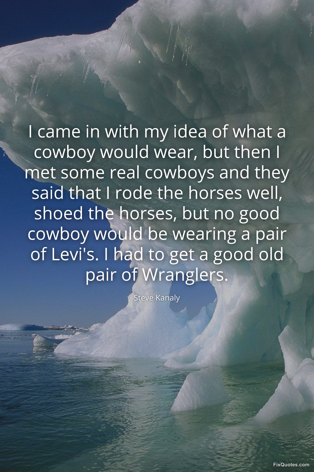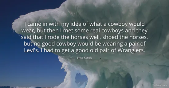 Kanaly, Steve. "I came in with my idea of what a cowboy would wear, but then I met some real cowboys and they said that I rode the horses well, shoed the horses, but no good cowboy would be wearing a pair of Levi's. I had to get a good old pair of Wranglers." FixQuotes. January 15, 2026. https://fixquotes.com/quotes/i-came-in-with-my-idea-of-what-a-cowboy-would-150091/.