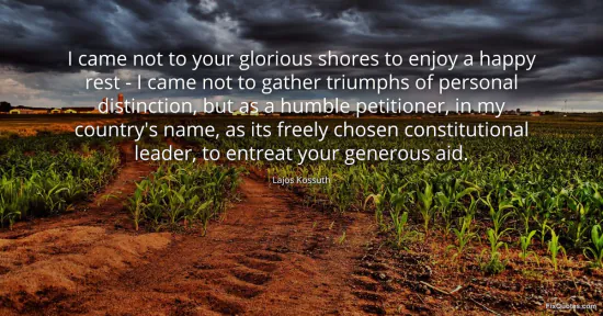 Kossuth, Lajos. (2026, January 15). I came not to your glorious shores to enjoy a happy rest - I came not to gather triumphs of personal distinction, but as a humble petitioner, in my country's name, as its freely chosen constitutional leader, to entreat your generous aid. FixQuotes. https://fixquotes.com/quotes/i-came-not-to-your-glorious-shores-to-enjoy-a-156529/