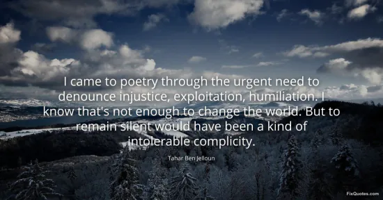 Jelloun, Tahar Ben. (2026, January 15). I came to poetry through the urgent need to denounce injustice, exploitation, humiliation. I know that's not enough to change the world. But to remain silent would have been a kind of intolerable complicity. FixQuotes. https://fixquotes.com/quotes/i-came-to-poetry-through-the-urgent-need-to-165874/