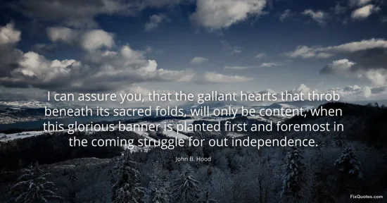Hood, John B. "I can assure you, that the gallant hearts that throb beneath its sacred folds, will only be content, when this glorious banner is planted first and foremost in the coming struggle for out independence." FixQuotes. January 16, 2026. https://fixquotes.com/quotes/i-can-assure-you-that-the-gallant-hearts-that-124505/.