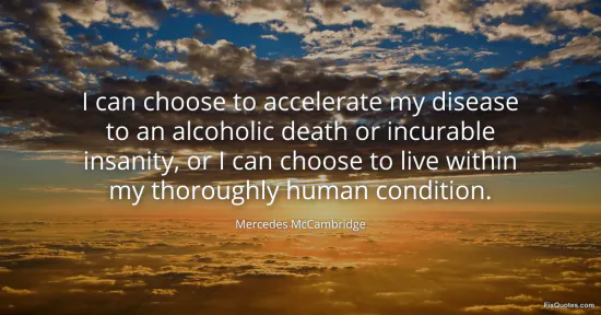 McCambridge, Mercedes. (2026, January 17). I can choose to accelerate my disease to an alcoholic death or incurable insanity, or I can choose to live within my thoroughly human condition. FixQuotes. https://fixquotes.com/quotes/i-can-choose-to-accelerate-my-disease-to-an-69083/